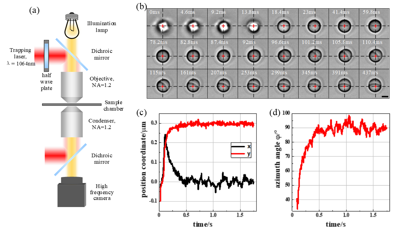光镊可控旋转是近年来光镊技术发展的新趋势之一,它有望突破传统光镊通常只具备三维空间直线运动的限制,不仅拓展了光镊微操控的自由度,还将为手性或螺旋型生物结构的研究注入新活力。实验室于2020年提出了基于二元复合微球(Janus球)的光镊可控旋转技术,发展了最低能量法仿真方法,获得了该球在光阱空间的三维稳态位姿。然而,最低能量法在微球瞬态受力分析方面存在局限。为分析非单一材质微球在光阱中的瞬态受力情况,实验室高晓晴博士发展了基于T矩阵的仿真方法,准确计算了微球在光阱中的瞬时受力,从而揭示了微球被光阱捕获过程中的姿态变化轨迹,并与实验结果完美一致。该方法不仅可以用于二元复合微球的光阱动力学研究,还可以推广到非规则形状多材质复合微结构的光阱受力计算。