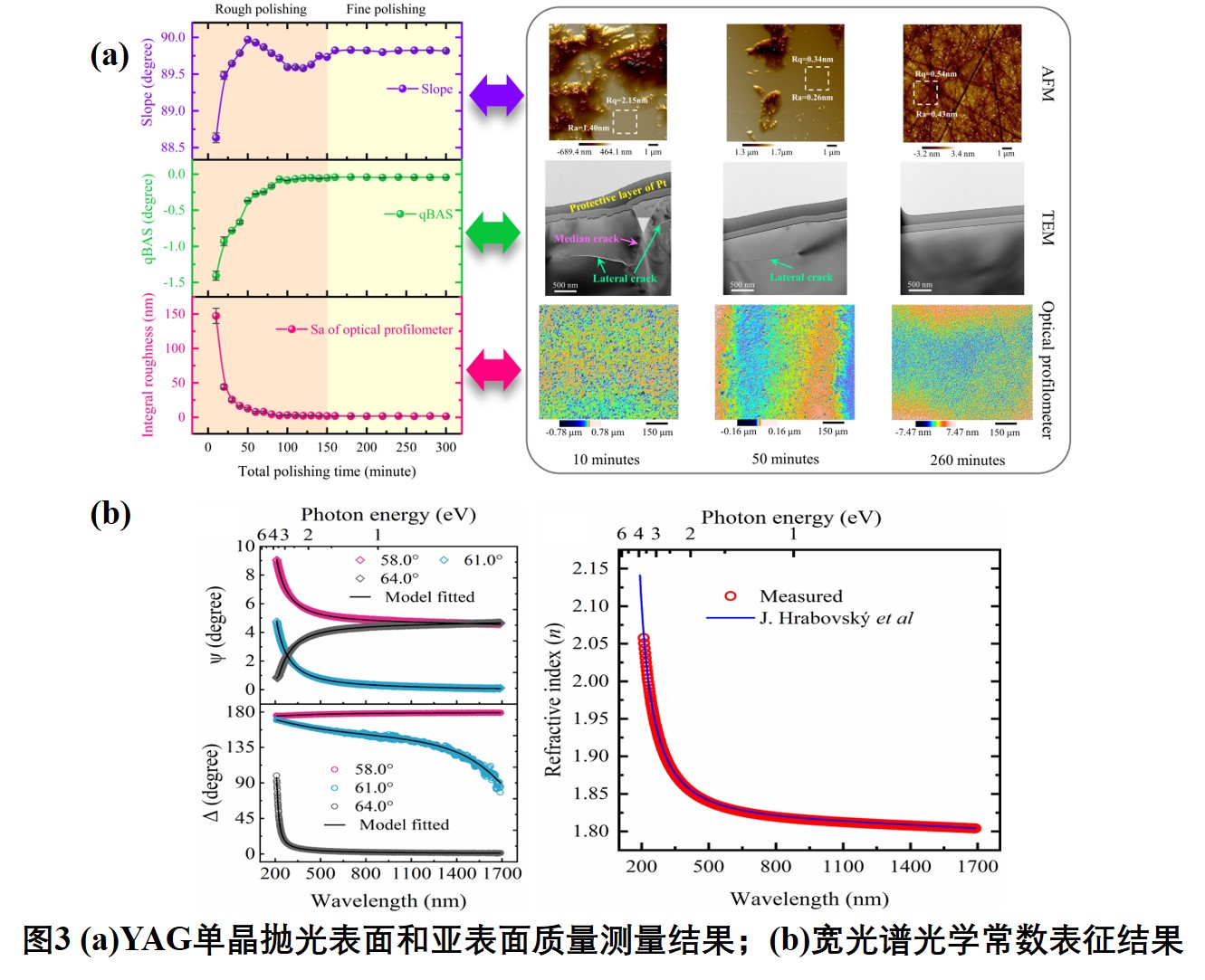 为深入研究粗抛前期qBAT测量结果趋势并揭示YAG单晶抛光过程中表面和亚表面演变机理,课题组通过优化损伤晶体光学模型,完善了布鲁斯特角附近椭偏参数与表面和亚表面质量之间的相关性。qBAS的单调性揭示了亚表面损伤的递减特征,而slope的振荡则反映了抛光表面上平面部分的原子级形貌演变,如图3所示[3]。此外,基于表面完整性评价结果,确定YAG单晶的宽光谱(210-1690nm)光学常数。本研究为监测和理解超精密制造中的表面/亚表面演变提供了新思路,同时促进了脆性固体的材料去除工艺优化及其相关应用。