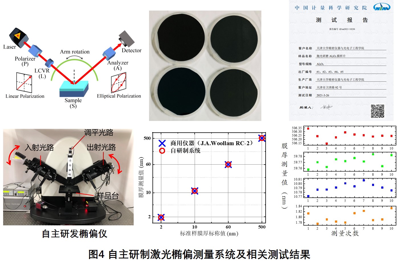 针对基于qBAT的抛光表面和亚表面损伤测量方法,课题组自主开发了基于液晶可变延迟器(LCVR)的可变角度激光椭偏测量系统,可用于激光晶体抛光表面完整性的高灵敏检测以及原子级薄膜厚度的高精度测量。通过设计系统校准方案确保测量结果准确性和鲁棒性,实现了亚纳米级的可重复性膜厚测量精度。系统膜厚测量指标与商用椭偏仪基本一致,且该系统测量性能已获得中国计量科学研究院出具的权威第三方认证,如图4所示[4]。