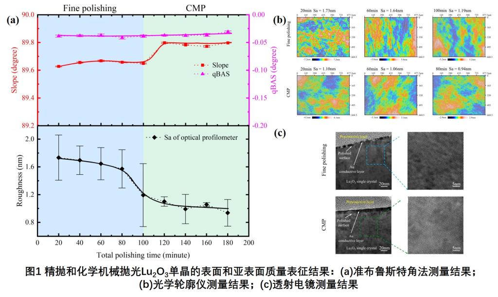 课题组为解决超精密制造领域抛光表面和亚表面损伤高效、高精度表征的迫切需求,创新性提出并发展了基于准布鲁斯特角法(qBAT)的激光晶体抛光表面和亚表面质量的高灵敏度、高精度同步检测技术,并自主开发了满足对应需求的可变角度激光椭偏测量系统。首先,针对精抛光和化学机械抛光Lu2O3单晶的表面完整性进行研究。发现在所采用抛光工艺条件下,表面质量指标(slope)揭示出表面粗糙度的亚纳米级提升过程,说明该方法的高灵敏度;亚表面损伤指标(qBAS)接近理想值且保持稳定,反映出该工艺能获得较小亚表面损伤晶体,但无法进一步提升亚表面质量,如图1所示[1]。