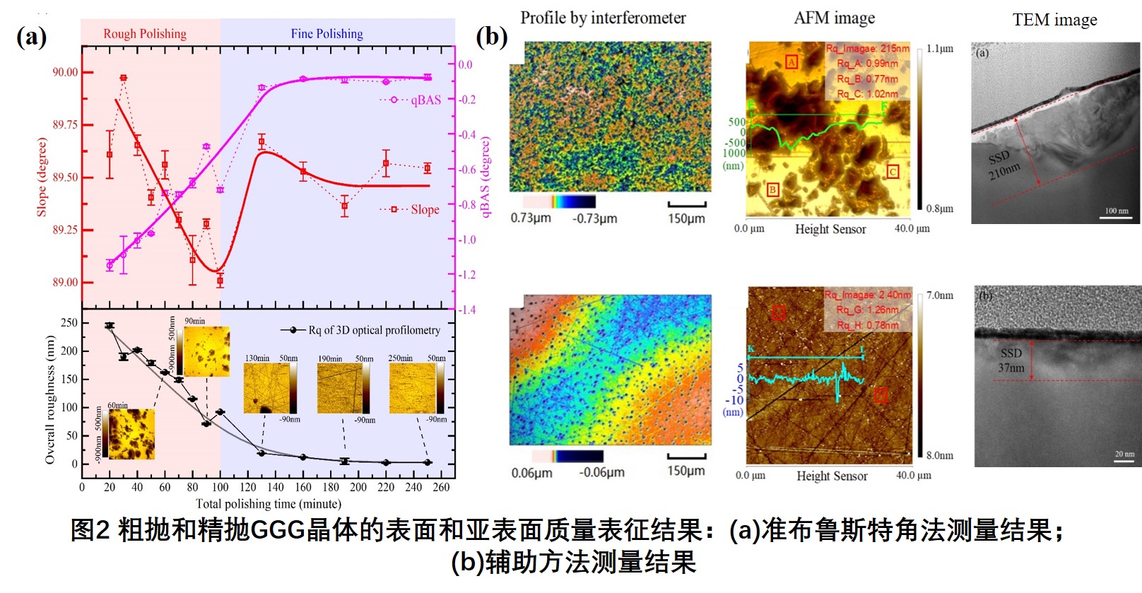 为突破常规qBAT只适用于高表面完整性样品的测量局限性,课题组通过设计晶体加工方案获得一系列具有不同表面和亚表面质量的粗抛和精抛GGG晶体,并对其表面和亚表面质量进行系统性表征。首次发现slope先下降再上升的变化趋势,反映了从粗抛到精抛过程中表面凹坑形貌的变化,如图2所示[2]。该结果验证了qBAT在粗抛和精抛阶段的可行性,将其适用范围拓展至粗抛阶段。